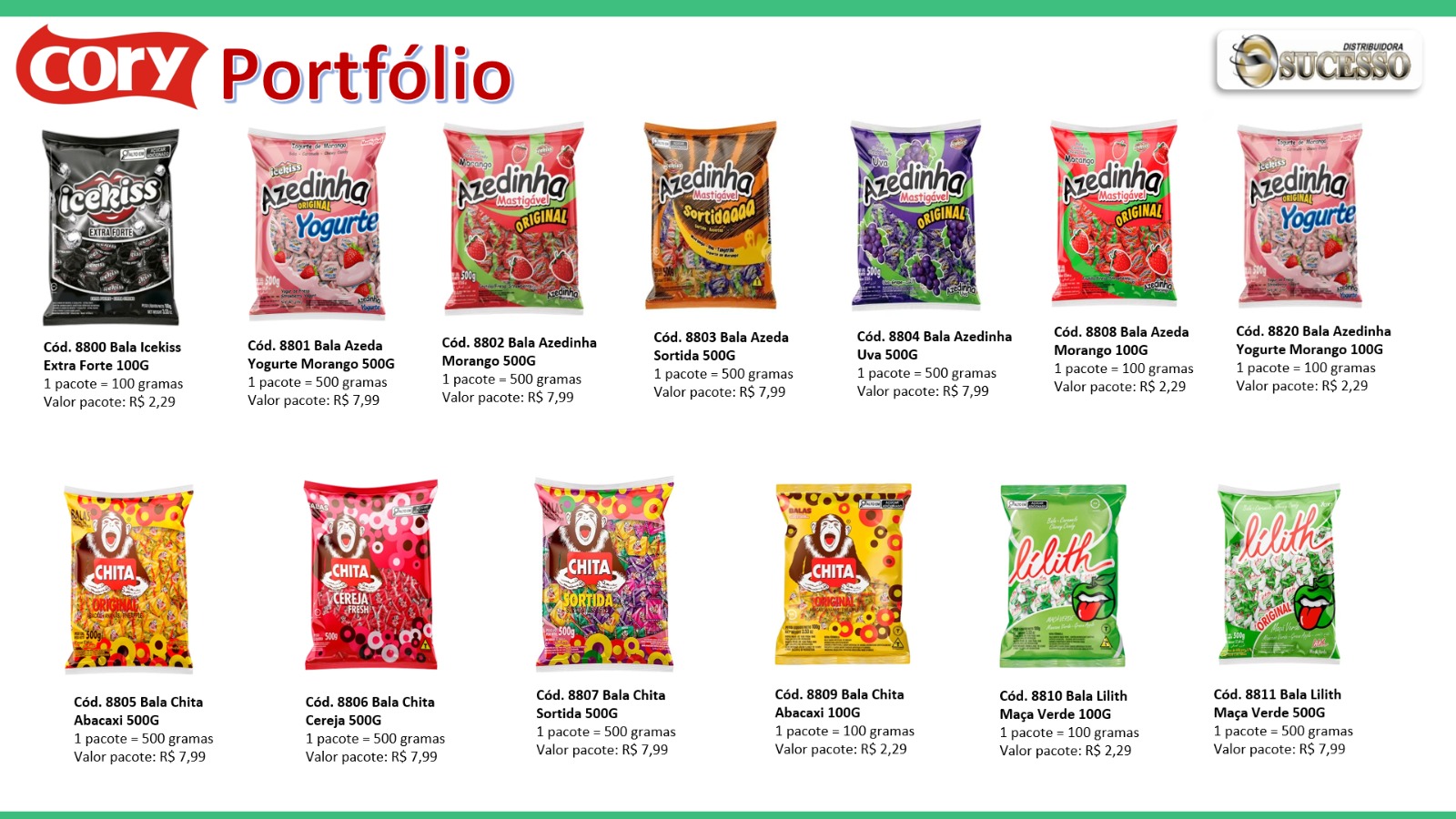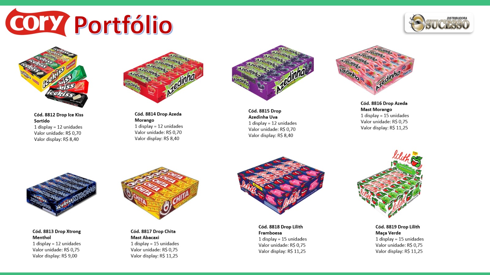 A Cory construiu marcas fortes como Icekiss, Ice Kiss Azedinha, Hipopó, Chita e Lilith, que são distribuídas nas linhas de drops, balas duras e mastigáveis, biscoitos cobertos, com chocolate, biscoitos recheados e biscoitos doces tradicionais.